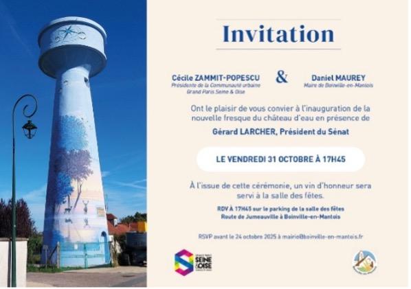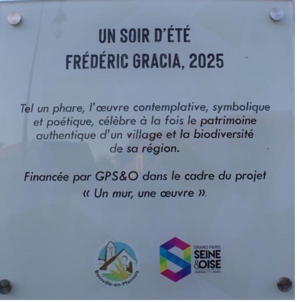 Dans le cadre de l’opération « un mur, une œuvre », la communauté urbaine du Grand Paris Seine et Oise (GPS&O) pour sa cinquième année a choisi d’offrir la surface du château d’eau de Boinville-en-Mantois (Yvelines) à M. Frederic Gracia afin d’y réaliser sa dernière fresque. Ce dernier nous a invité à l’inauguration.