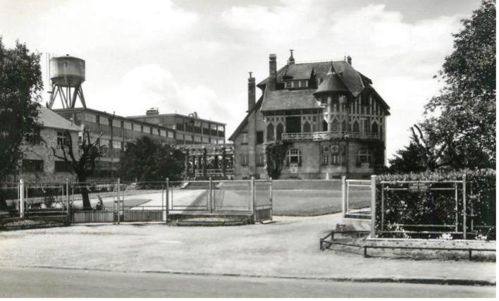 Les deux cartes postales ci-dessous sont d’époques différentes. Celle de gauche est datée de 1920, on devine au loin le train à vapeur, puis la maison des Sorbiers au centre et des bâtiments différents de la carte postale de droite. Les bâtiments de cette dernière sont construits après la deuxième Guerre Mondiale. Sur une photo prise pendant la guerre, seul le bâtiment des machines et le château d’eau sur le toit existent.
