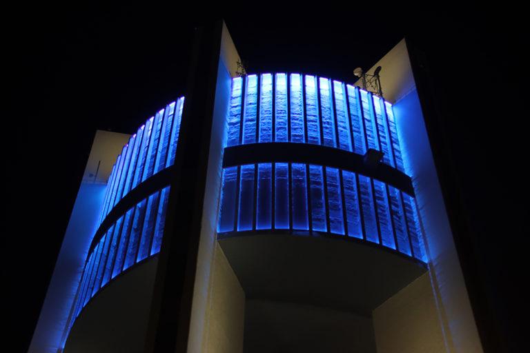 - En étant mis en lumière (éclairage nuit bleu et blanc) et valorisé, il montre comment un ouvrage utilitaire peut devenir un repère urbain apprécié.