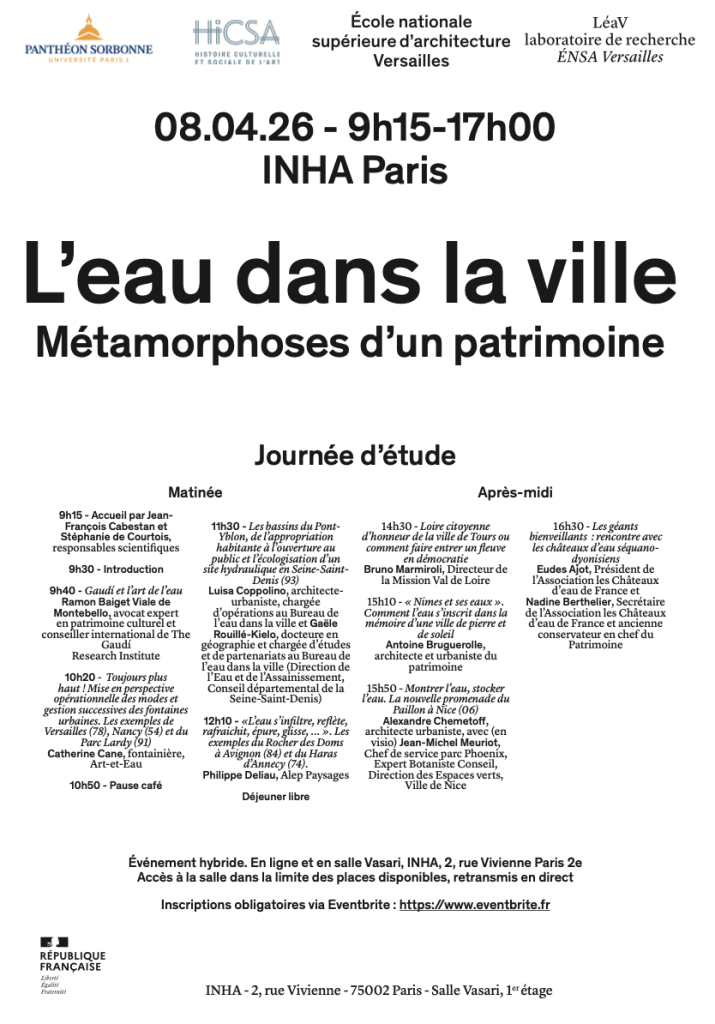 Le 8 avril 2026, l’Institut national d’histoire de l’art (INHA) à Paris accueillera une journée d’étude intitulée « L’eau dans la ville. Métamorphoses d’un patrimoine », réunissant chercheurs, architectes, urbanistes et acteurs du patrimoine autour des enjeux contemporains liés à l’eau en milieu urbain.